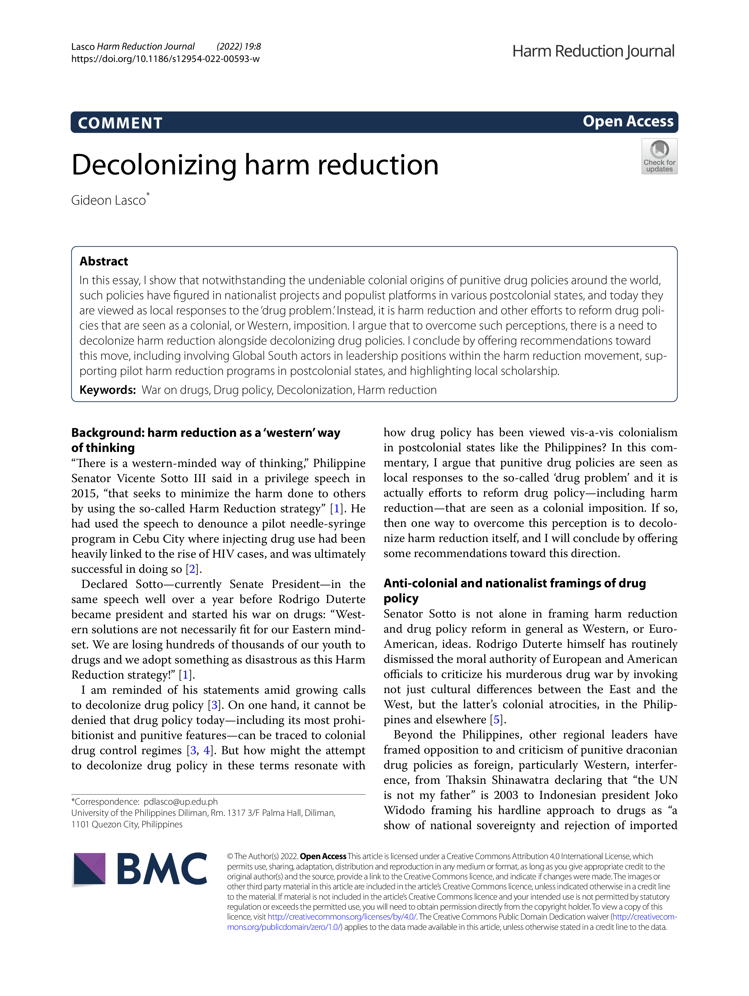Lasco, G. Decolonizing harm reduction. Harm Reduct J 19, 8 (2022). https://doi.org/10.1186/s12954-022-00593-w
