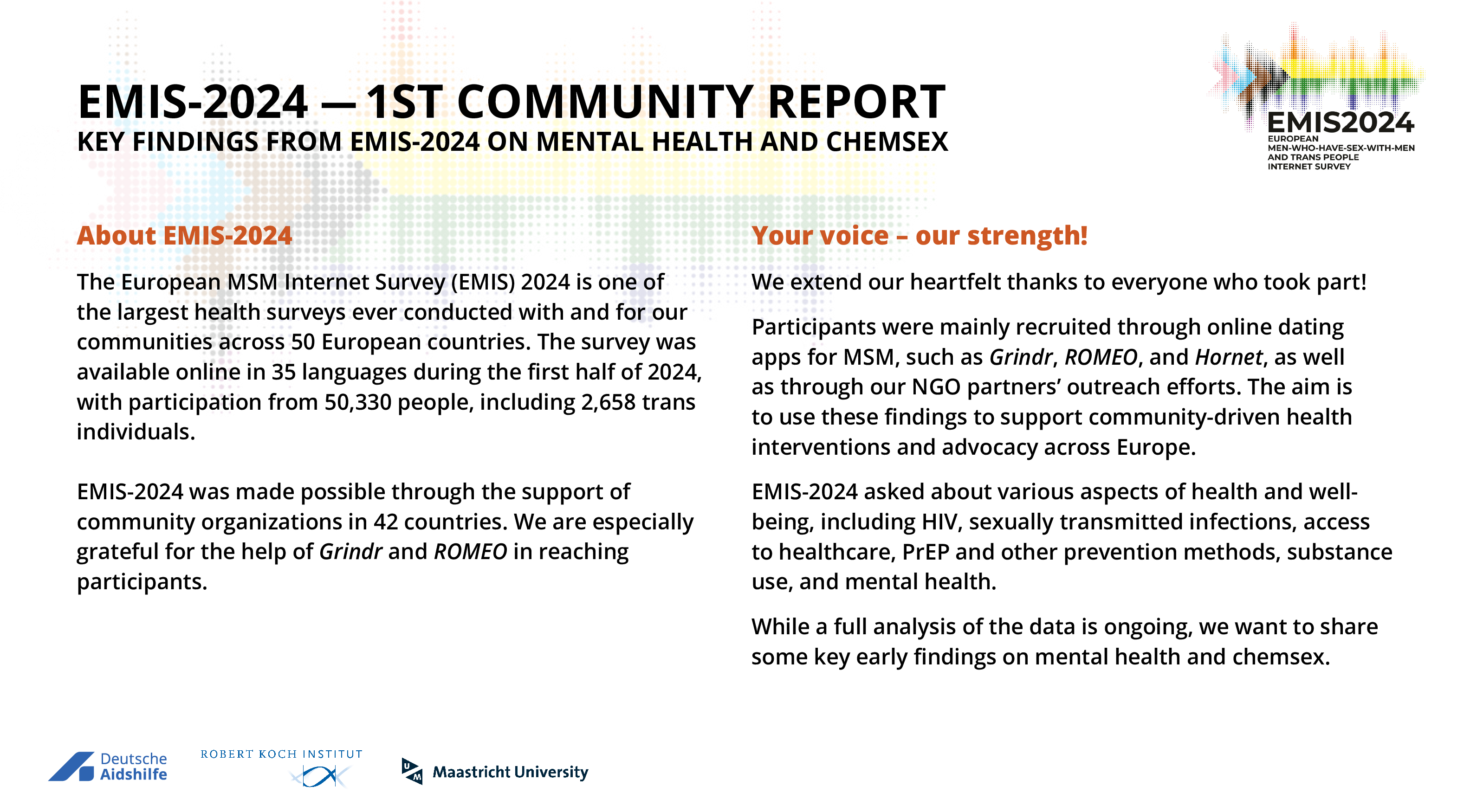 The first Community Report focusses on mental health and chemsex." (https://www.emis-project.eu/emis-2024-community-reports-europe/)