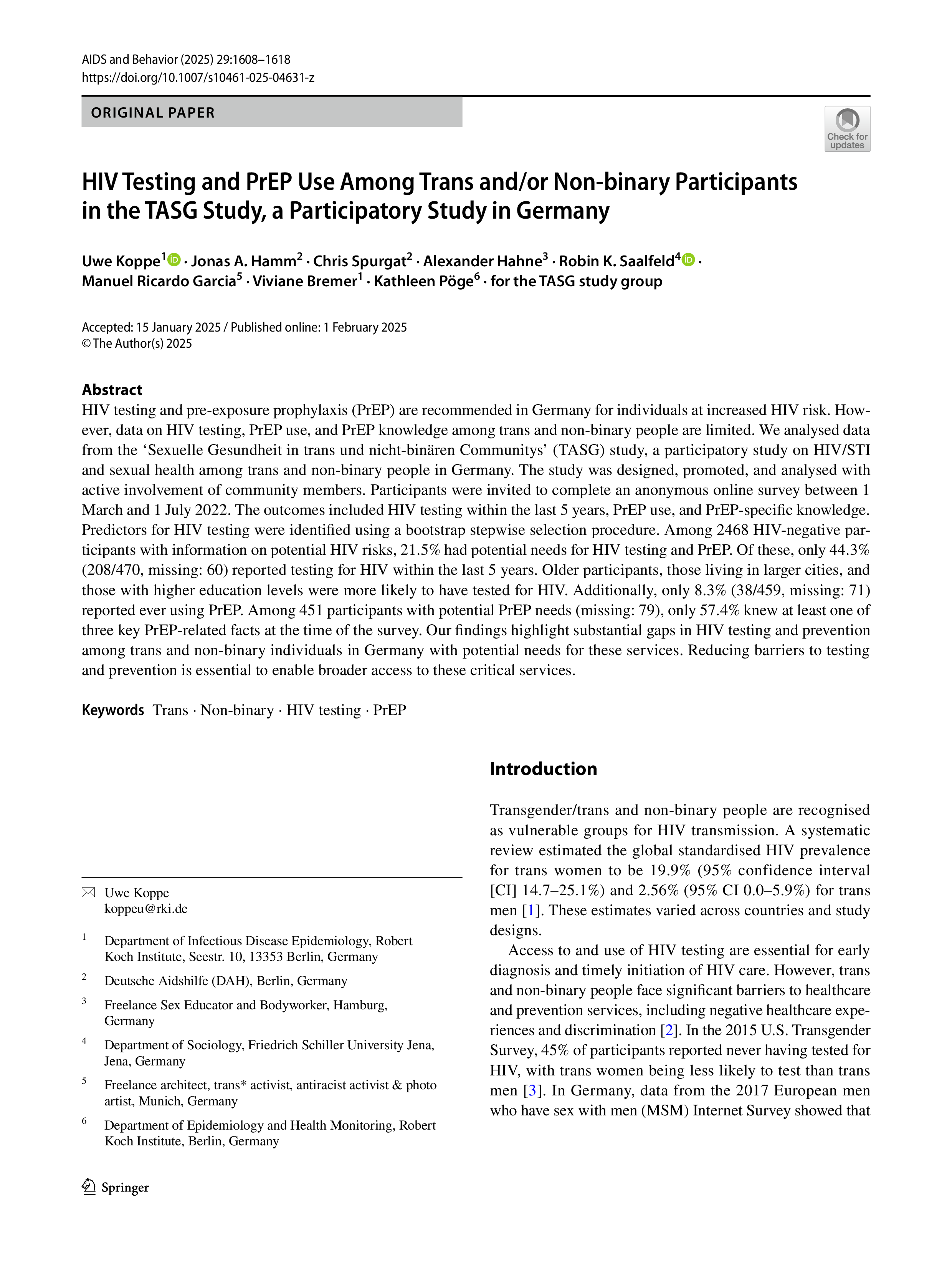 from the ‘Sexuelle Gesundheit in trans und nicht-binären Communitys’ (TASG) study, a participatory study on HIV/STI